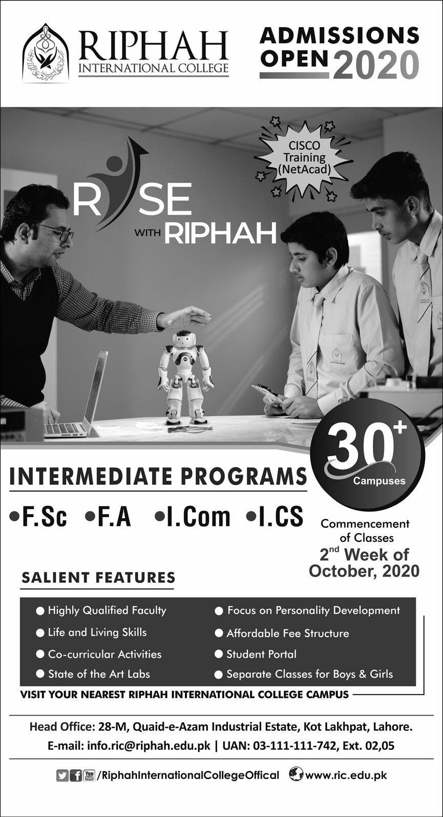 Riphah International College is a private college has announced admissions in intermediate, FSc Pre Engineering, FSc Pre Medical, FA, I-Com Commerce and ICS Computer Science in Lahore. Read newspaper ad for exact details.