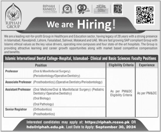Latest Government jobs in Riphah International Hospital in Teaching and others can be applied till 29 September 2024 or as per closing date in newspaper ad. Read complete ad online to know how to apply on latest Riphah International Hospital job opportunities.