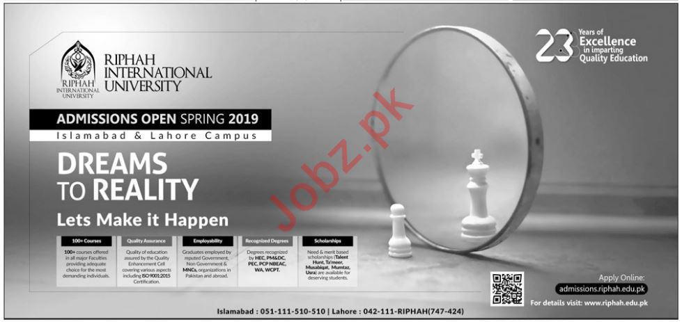 Riphah International University Islamabad Campus, Pakistan are started admissions spring 2019 for the classes of BA, MA, BSc, MSc, B Com, BBA, MBA, M Phil, PhD, BS, BE, BCS. Read newspaper ad for exact details.