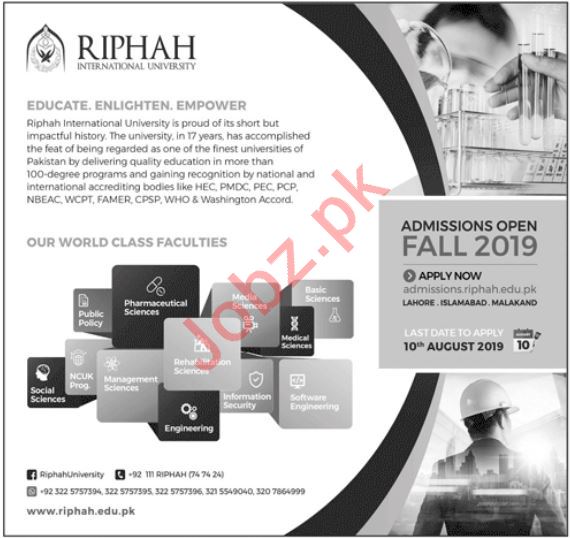 Riphah International University Lahore Campus, Pakistan are starting admissions fall 2019 for the classes of Master in Engineering, Media Science, Pharmaceutical Science and Management Science. Read newspaper ad for exact details.