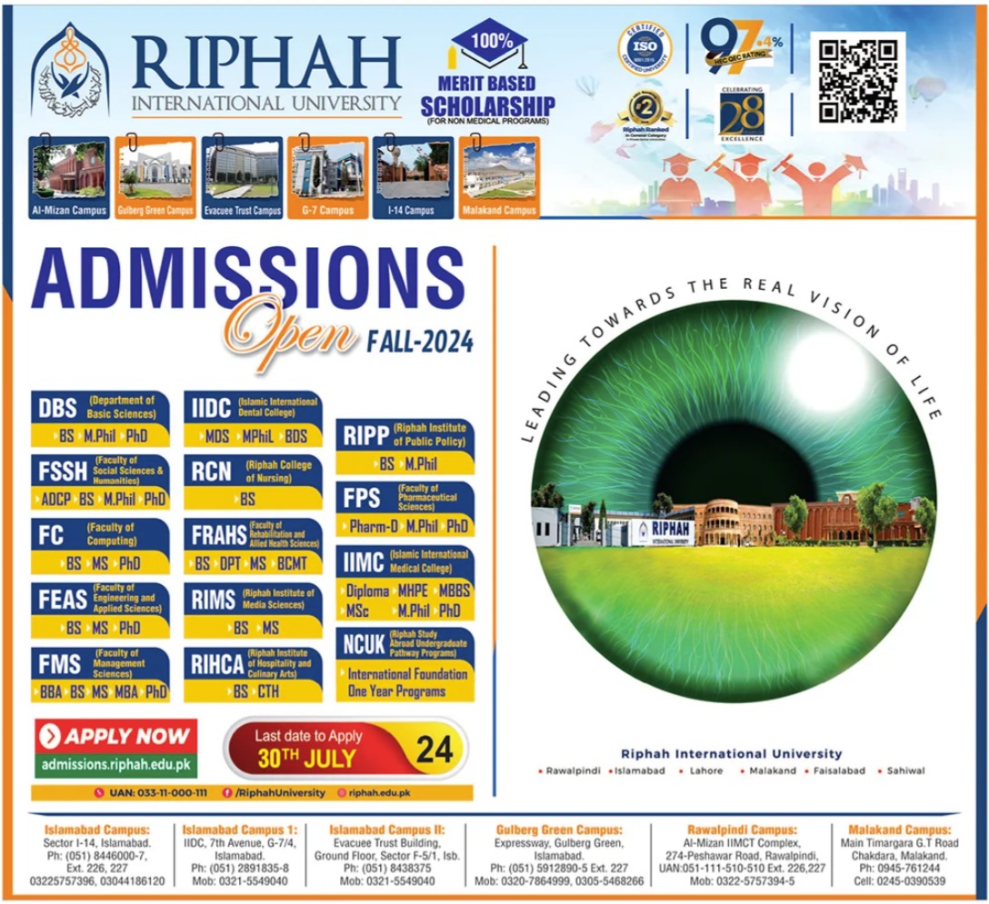 Riphah International University BS, M Phil, PhD, ADCP, BS, BDS, MDS, DPT, MS, BCMT, Diploma, MHPE, MBBS, CTH admissions 2024 has been started. Students can enroll for admissions in Riphah International University Islamabad Rawalpindi Islamabad Pakistan for academic year 2024 to continue campus based or online education in Teaching University. Eligible candidates for admissions in Mphil, BBA, Phd, BS, MS and MBBS can apply as per Private institute criteria and before closing date 30 July 2024 after reading advertisement online. Read newspaper ad for exact details.