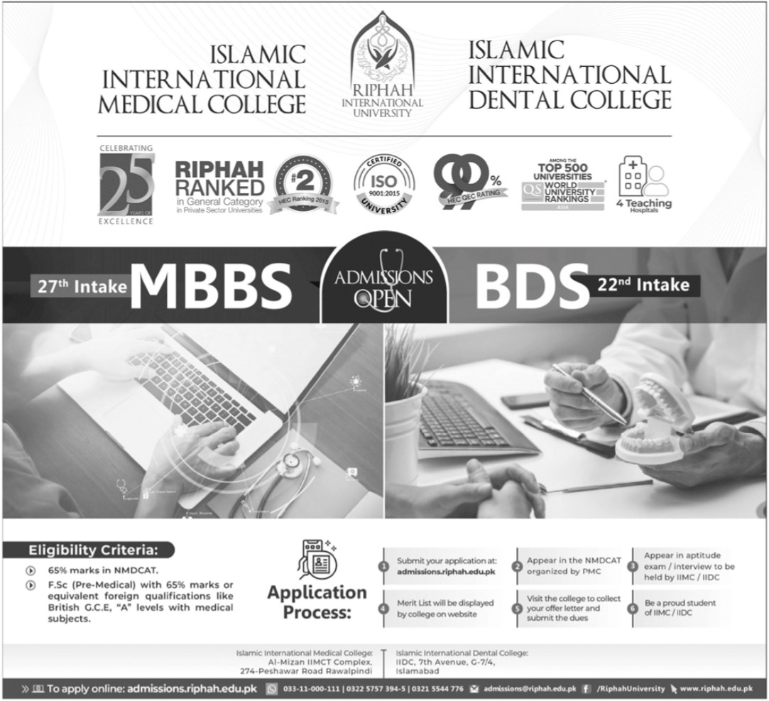 Riphah International University is a private sector university has announced admissions in ​Bachelor of Medicine, Bachelor of Surgery​ MBBS and Bachelor of Dental Surgery BDS degree programs 2021. Read newspaper ad for exact details.