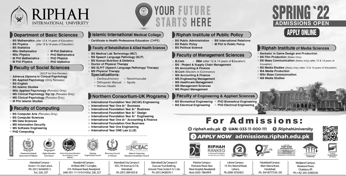 Riphah International University BS in Mathematics, Physics, Statistics, Medical Laboratory Technology MLT, Speech Language Pathology SLP, Public Administration, Political Science, Human Nutrition & Dietetics, Film Production, Game Design & Production, English, Islamic Studies, Computer Science, Computer Arts, Applied Psychology, MS, MSc, Mphil, PhD, BBA, MBA admissions 2022 has been started. Riphah International University Islamabad Islamabad Pakistan welcomes students to apply for admissions in academic year 2022 in Management University. Students for admissions in Phd, Mphil, MBA, M.sc, Master, BBA, Bachelor, BS Hons and Others can apply for online or campus classes as per Government institute criteria till admission closing date February 26, 2022. Read newspaper ad for exact details.