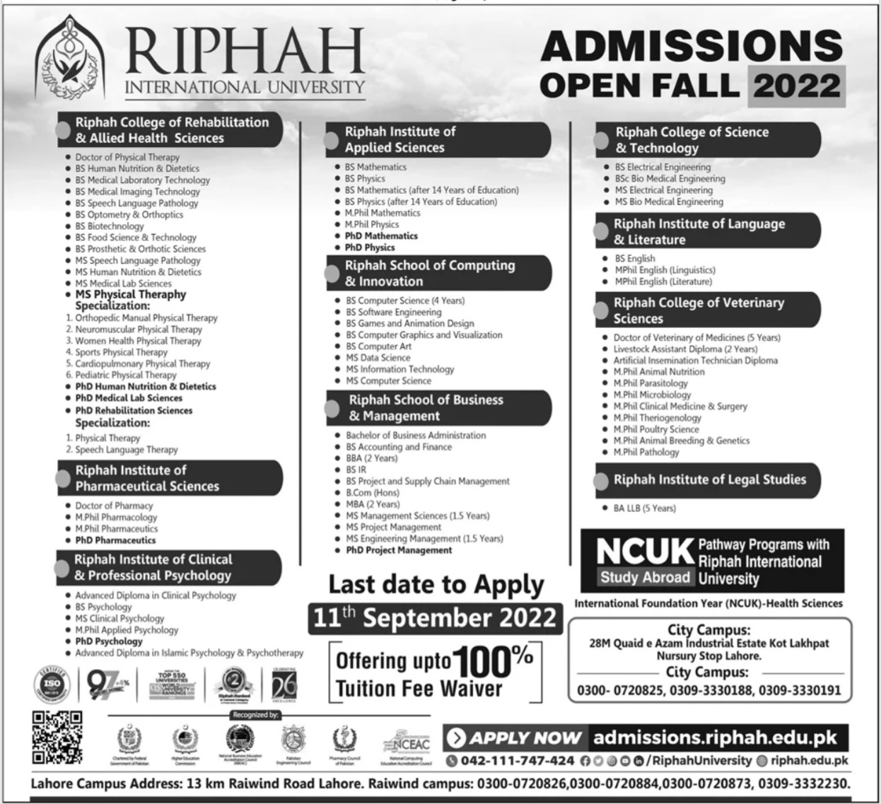 Riphah International College has announced admissions 2022 for Admissions in Rehabilitation & Allied Health Sciences, Pharmaceutical Sciences, Clinical & Professional Psychology, Applied Sciences, Computing & Innovation, Business and Management.. Students who want to take admissions in Riphah International College Lahore Punjab Pakistan for academic year 2022 to continue education in Teaching University can apply. Eligible students for fulfilling criteria for admissions in Bachelor, Master, Mphil and Phd can enroll as per Private admission policy 2022 till closing date 11 September 2022. Read newspaper ad for exact details.