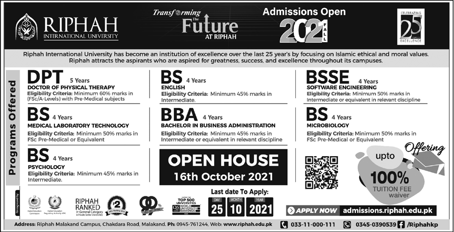 Riphah International University DPT BS BBA Admissions in KP