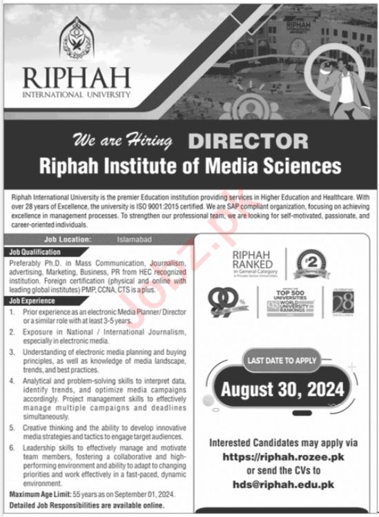 Latest Education jobs and others Private jobs in Riphah International University closing date is around August 30, 2024, see exact from ad. Read complete ad online to know how to apply on latest Riphah International University job opportunities.