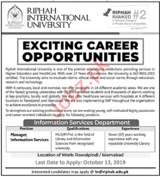 Riphah International University Islamabad Jobs For Managers