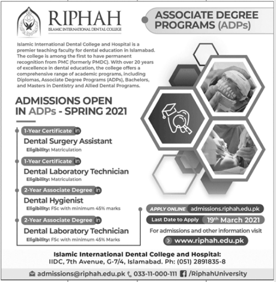 Riphah International University is a private sector university has announced admissions in Associate Degree Programs ADPs and Certificates in Islamabad Pakistan 2021. Read newspaper ad for exact details.