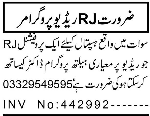 Radio Channel jobs advertisement dated about 4 July 2025 in daily Aaj Newspaper invites application for the vacant post of radio programmer and rj radio programmer in Swat, swat Khyber Pakhtunkhwa KPK Pakistan. Persons with Intermediate, Bachelor and Others etc. education can apply.