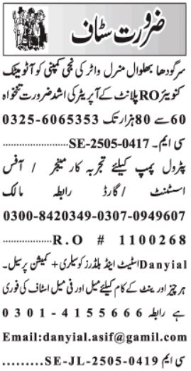 Vacant posts including office assistant, office staff, manager, ro plant operator, real estate agent and guard are announced in Private Company Bhalwal Islam Pura Sargodha, lahore Punjab Pakistan as per 14 May 2025 advertisement in daily Jang Newspaper. Candidates with Intermediate, DAE, Matric, Middle, Bachelor and BA etc. educational background will be preferred.
