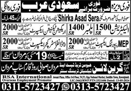 Green Line Human Resource Manpower invites applications for job positions advertised in daily Express dated 18 May 2024 for following vacancies in Riyadh, dammam Saudi Arabia.