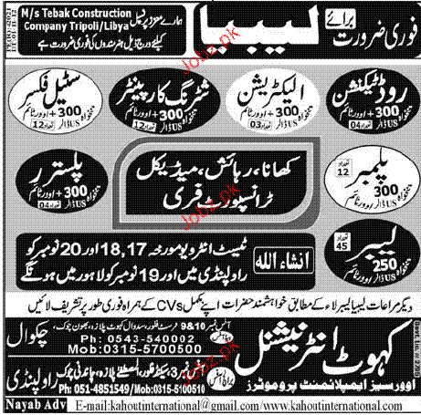 Road Technicians, Electricians, Shuttering Carpenters Wanted