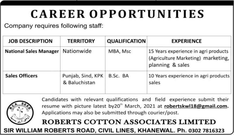 Latest Roberts Cotton Associates Limited RCAL Sales Posts Khanewal 2025
