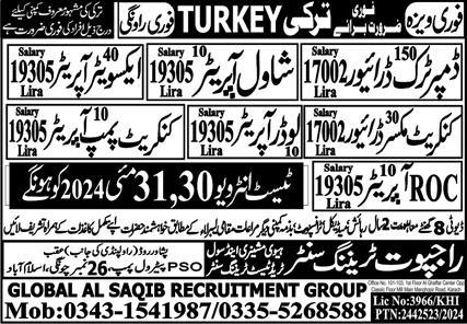 Vacant posts including concrete pump operator, concrete mixer driver, shawl operator, roc operator, excavator operator, loader operator and dumper truck driver are announced in Global Al Saqib Recruitment Group Ankara, istanbul Turkey as per 29 May 2024 advertisement in daily Express Newspaper. Educational qualifications required Intermediate, DAE, Matric and Bachelor etc.