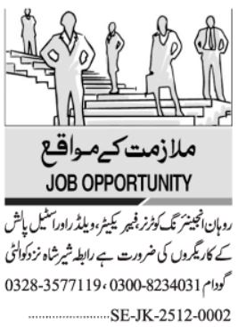 Vacant posts including fabricator, steel polisher, welder and turner are announced in Engineering Company Shershah Karachi, karachi Sindh Pakistan as per 2 December 2025 advertisement in daily Jang Newspaper. Educational qualifications required DAE, Matric and Middle etc.