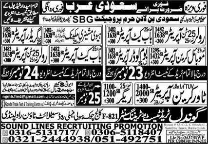 Vacant posts including rigger, heavy machinery mechanic, roller operator, mobile crane operator, greeder operator, boom loader operator, bobkat operator and tower crane operator are announced in Sound Lines Recruiting Promotion Riyadh, riyadh Saudi Arabia as per 23 November 2022 advertisement in daily Express Newspaper. Preferred Education is Matric and Intermediate etc.
