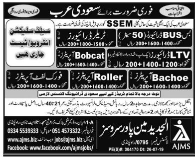 A Well-Known Private Overseas Company in Saudi Arabia is looking for qualified, expert and Well-Mannered staff for their Organization for the Job of Bus Drivers, Trala Drivers, LTV Drivers, Bobcat Operators, Bachoe Operators, Roller Operators and Forklift Operator.