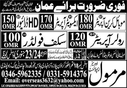 Marmol Overseas Employment is looking for candidates for following posts as per job advertisement published in daily Express Newspaper of January 22, 2025 for location Muscat, muscat Oman: