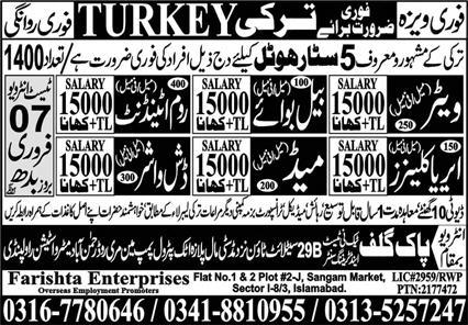 Pak Gulf Tec Ni Test & Training Center jobs advertisement dated about 6 February 2024 in daily Express Newspaper invites application for the vacant post of bell boy, area cleaner, maid, waiter, dishwasher and room attendant in Istanbul, ankara Turkey. Persons with Intermediate and Matric etc. education can apply.