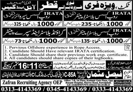 Zafran Recruiting Agency jobs advertisement dated about 10 September 2023 in daily Express Newspaper invites application for the vacant post of rope access painter, rope access blaster, ground blaster spray painter and rope access supervisor in Qatar, qatar Qatar. Persons with Middle, Matric and Intermediate etc. education can apply.