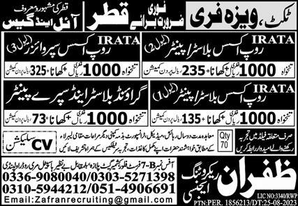 Zafran Recruiting Agency Qatar, qatar Qatar invites applications from eligible candidates for the post of ground blaster spray painter, irata rope access supervisor, painter and roap access blaster as per advertisement of September 19, 2023 published in daily Express Newspaper. DAE, Intermediate, Matric and Bachelor etc. educational qualification will be preferred.