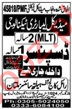 Royal College of Pharmacy Technician & Health Sciences Multan, Pakistan is opening admissions fall 2020 for the classes of Professional Diploma in Medical Laboratory Technology, MLT & Dispenser. Read newspaper ad for exact details.