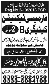 Royal College of Pharmacy Technician & Health Sciences has announced admissions for 2 Year paramedical diploma in Pharmacy Technician in Multan Punjab Pakistan 2021. Read newspaper ad for exact details.