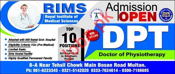 Royal Institute of Medical Sciences RIMS has announced admissions in Doctor of Physiotherapy DPT in Multan. RIMS is well known medical institute. Limited Seats are available. Read newspaper ad for exact details.