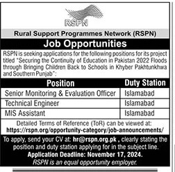 Vacant posts including technical engineer, monitoring evaluation officer and mis assistant are announced in Rural Support Programmes Network RSPN Islamabad, islamabad Islamabad Pakistan as per 9 November 2024 advertisement in daily The News Newspaper. Candidates with MS, Master and Bachelor etc. educational background will be preferred.