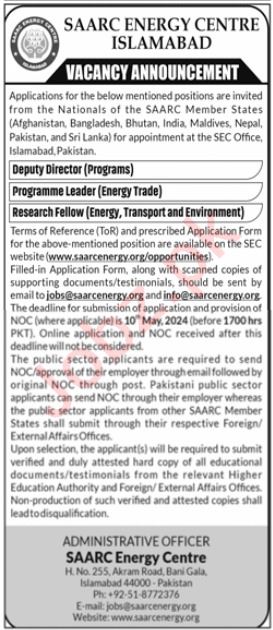 Vacancies in Saarc Energy Center SEC Advertisement April 2024