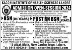 SACON Institute of Health Sciences admissions 2024 for BSN, Post RN BSN has been announced. SACON Institute of Health Sciences Lahore Punjab Pakistan welcomes students to apply for admissions in academic year 2024 in Medical Medical College. Students who want to enroll for academic session 2024 in BSN qualification and admission criteria for Private institute can apply till last date 15 February 2024. Read newspaper ad for exact details.