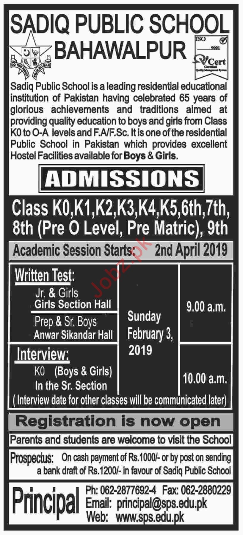 Sadiq Public School Bahawalpur, Pakistan are announced admissions spring 2019 for the classes of Class K0, K1, K 2, K3, K4, K5 to Pre O Level, Pre Matric, 9th Class. Read newspaper ad for exact details.