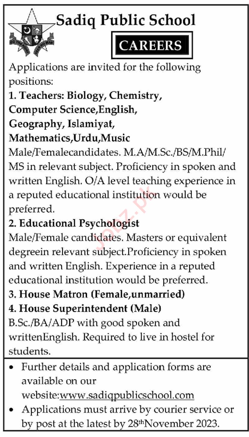 Sadiq Public School jobs advertisement dated about 19 November 2023 in daily Dawn Newspaper invites application for the vacant post of Islamiyat Teacher, Chemistry Teacher, House Matron, Music Teacher, Mathematics Teacher, Geography Teacher, Educational Psychologist, House Superintendent, Biology Teacher, Computer Science Teacher, Teacher, Urdu Teacher and English Teacher in Karachi, karachi Sindh Pakistan. Educational qualifications required Master, Intermediate, Bachelor and MS etc.