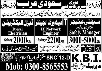 Vacant posts including it network engineer, diesel electrician and safety manager are announced in Khawar Baig International Overseas Employment Promoters KBI Riyadh, riyadh Saudi Arabia as per 29 May 2024 advertisement in daily Express Newspaper. Persons with Intermediate and Bachelor etc. education can apply.
