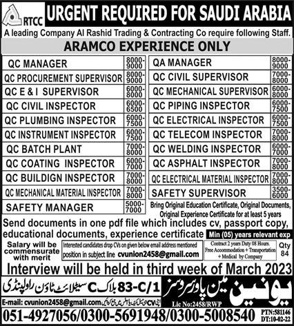 Union Manpower Services jobs advertisement dated about 10 March 2023 in daily Express Newspaper invites application for the vacant post of qc procurement supervisor, qc instrument inspector, qc telecom inspector, qc manager, qc mechanical supervisor, qc material inspector, qc piping inspector, civil qc inspector, qc electrical material inspector, qa manager, qc civil supervisor, safety manager, qc asphalt inspector, qc coating inspector, building qc inspector, qc plumbing inspector, qc bath plant, qc electrical inspector, safety supervisor and qc welding inspector in Riyadh, dammam Saudi Arabia. Persons with Bachelor, Matric and Intermediate etc. education can apply.