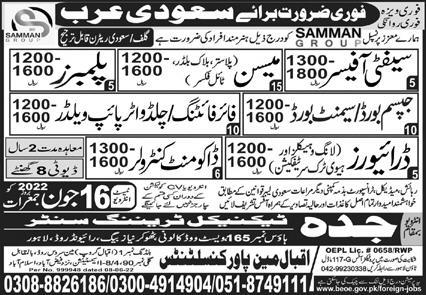Vacant posts including fire fighting technician, block mason, driver, document controller, plumber, gypsum board carpenter, plaster mason, cement board carpenter, tile fixer, htv driver, safety officer, mason, truck driver and chilled waterpipe fitter are announced in Jeddah Trade Test & Technical Training Center Dammam, dammam Saudi Arabia as per 13 June 2022 advertisement in daily Express Newspaper. Preferred Education is Middle, Intermediate and Matric etc.
