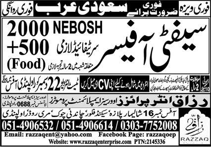 Razzaq Enterprises invites applications for job positions advertised in daily Express dated 21 December 2023 for following vacancies in Riyadh, tabuk Saudi Arabia.