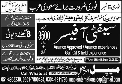 Maple International Overseas Employment Promoters jobs advertisement dated about 22 November 2024 in daily Express Newspaper invites application for the vacant post of safety officer in Dammam, riyadh Saudi Arabia. Educational qualifications required DAE, Intermediate, Bachelor and B.E etc.