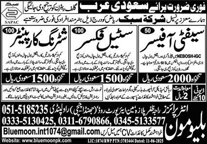 Vacant posts including shuttering carpenter, steel fixer and safety officer are announced in Blue Moon Enterprises Dammam, jeddah Saudi Arabia as per 13 June 2025 advertisement in daily Express Newspaper. Preferred Education is Bachelor, Intermediate, Matric and DAE etc.