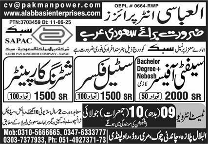 Al Abbasi Enterprises invites applications for job positions advertised in daily Express dated 2 July 2025 for following vacancies in Riyadh, makkah Saudi Arabia.