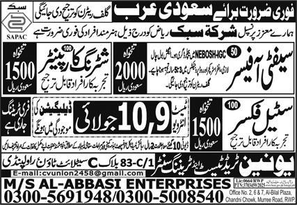 Vacant posts including safety officer, shuttering carpenter and steel fixer are announced in Union Trade Test and Training Center Riyadh, tabuk Saudi Arabia as per 8 July 2025 advertisement in daily Express Newspaper. Educational qualifications required Bachelor, Intermediate, DAE and Matric etc.