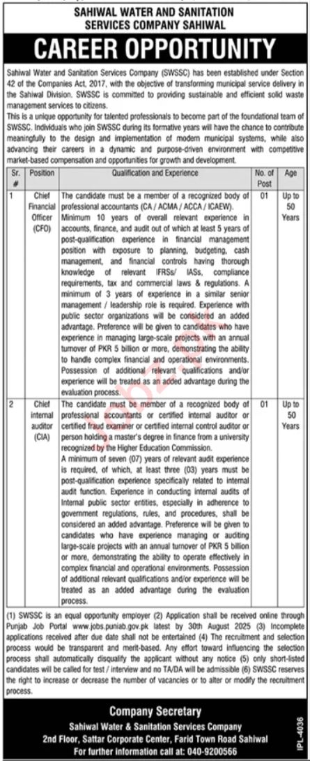 Vacant posts including chief financial officer and chief internal auditor are announced in Sahiwal Water & Sanitation Services Company SWSSC Farid Town Road Sahiwal, sahiwal Punjab Pakistan as per 11 August 2025 advertisement in daily Dunya Newspaper. Preferred Education is ACCA, Bachelor, Master, CA and Others etc.