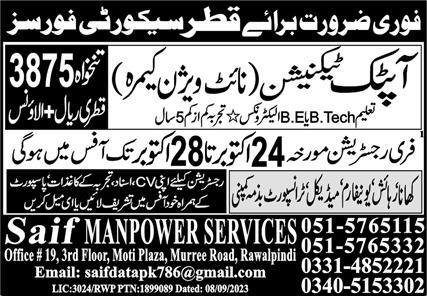 Vacant posts including optic technician are announced in Saif Manpower Services Qatar, qatar Qatar as per 25 October 2023 advertisement in daily Express Newspaper. Preferred Education is Middle and Matric etc.
