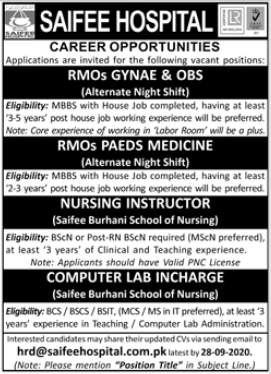 Saifee Hospital invites applications from medical, health, mbbs, doctors and experienced candidates for the posts of Resident Medical Officer Gynecology, Resident Medical Officer Obstetric, Resident Medical Officer Paeds Medicine, Nursing Instructor and Computer Lab Incharge in Karachi.