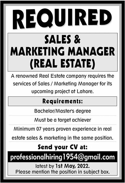 Real Estate Company jobs advertisement dated about 24 April 2022 in daily The News Newspaper invites application for the vacant post of sales manaer and marketing manager in Lahore, lahore Punjab Pakistan. Candidates with Bachelor and Master etc. educational background will be preferred.