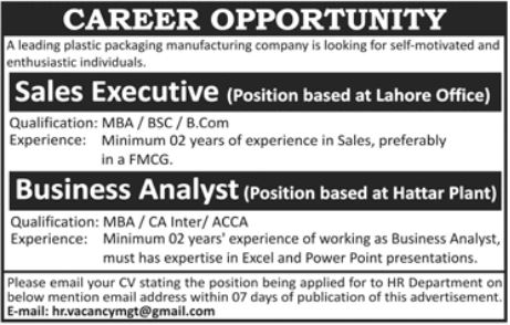 Latest Plastic Packaging Manufacturing Company Management Posts Lahore 2025