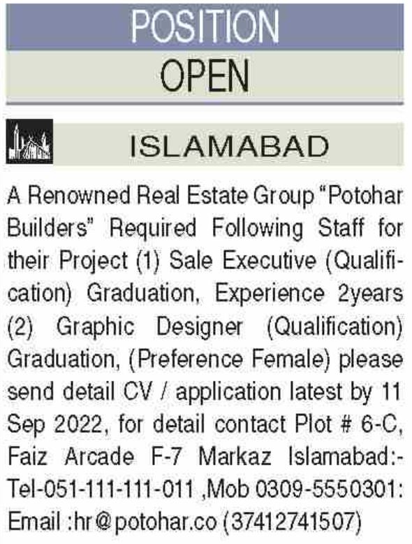 Vacant posts including sales executive and graphic designer are announced in Potohar Corporation Islamabad, islamabad Islamabad Pakistan as per 7 September 2022 advertisement in daily Dawn Newspaper. Persons with Bachelor and Intermediate etc. education can apply.