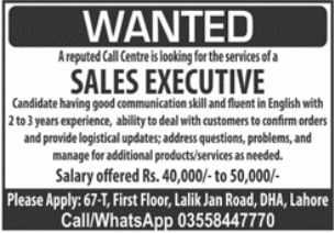 Vacant posts including sales executive are announced in Call Center Lahore, lahore Punjab Pakistan as per 6 January 2023 advertisement in daily Jang Newspaper. Educational qualifications required Bachelor and Master etc.