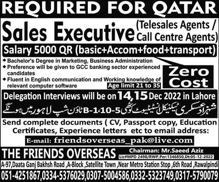 The Friends Overseas Service jobs advertisement dated about 13 December 2022 in daily Express Newspaper invites application for the vacant post of sales executive in Qatar, qatar Qatar. Bachelor etc. educational qualification will be preferred.