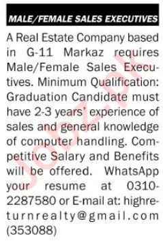 Real Estate Company jobs advertisement dated about 12 May 2022 in daily The News Newspaper invites application for the vacant post of sales executive in Islamabad, islamabad Islamabad Pakistan. Persons with Bachelor etc. education can apply.